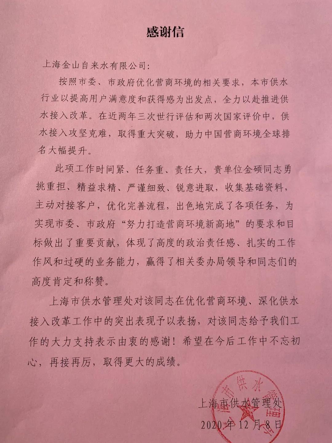 近日,上海金山自来水有限公司收到了一封来自“上海市供水管理处”的感谢信,对于金硕同志在优化营商环境、深化供水接入改革工作过程中的大力支持与快速响应表示衷心的感谢。