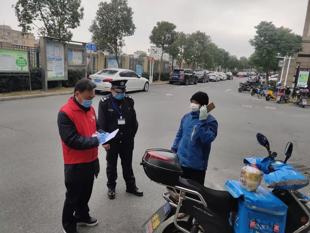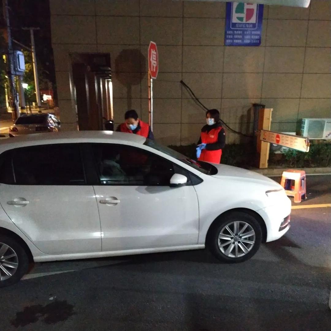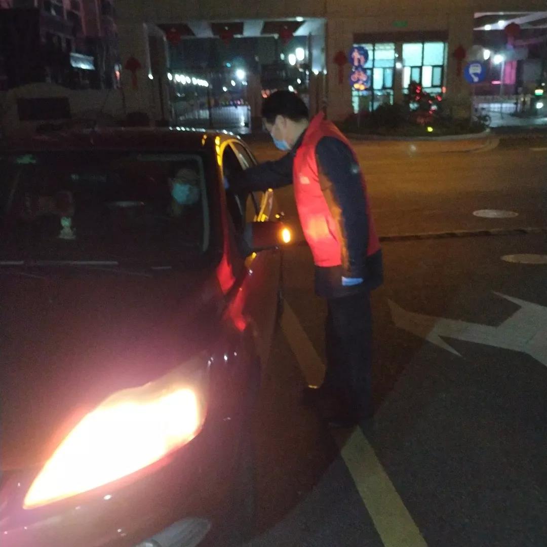 党员志愿者叶雪云同志夜间协助居委会工作人员对出入新汇景园的车辆进行排摸,为居民测量体温。