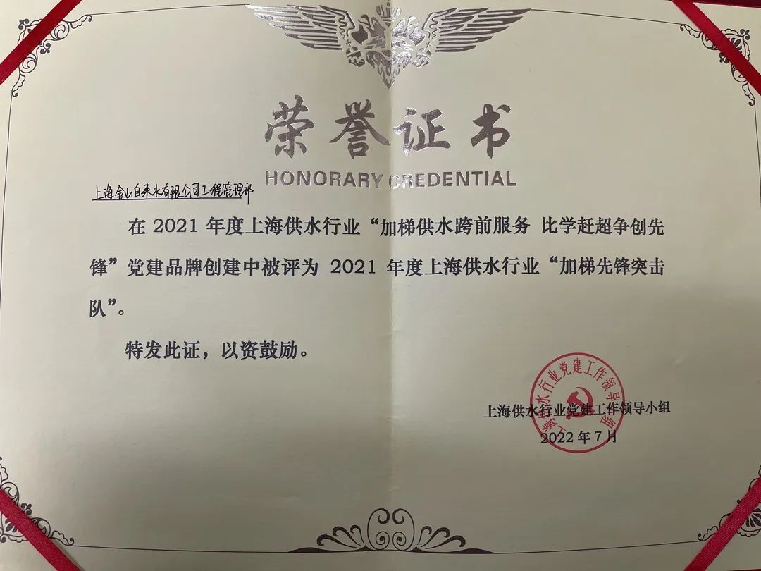石俊同志在在2021年度上海供水行业“加梯供水跨前服务 比学赶超争创先锋”党建品牌创建中评为2021年度上海供水行业“加梯先锋”荣誉称号。