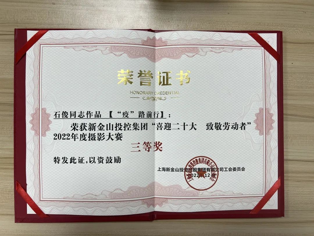 新金山投控集团“喜迎二十大 致敬劳动者”2022年度摄影大赛优秀组织奖。