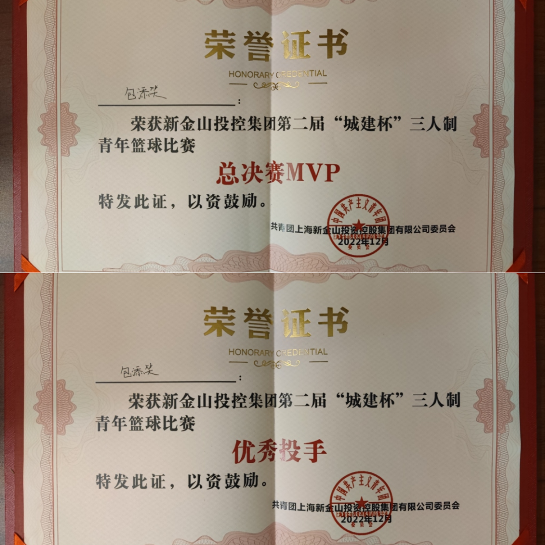 包添笑同志在三人制青年篮球赛中荣获“优秀投手”、“MVP”荣誉称号。
