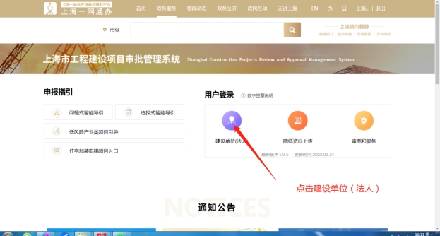 1、建设单位在电脑插入法人一证通后登录:https://zwdt.sh.gov.cn/govPortals/cprams/index