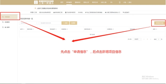 4、先点击左上方的“申请信息”,然后点击右上方的“项目申请”。