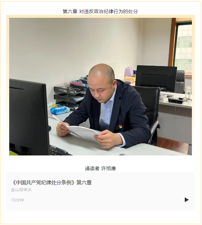 为深入贯彻落实《中共中央关于在全党开展党纪学习教育的通知》(中办发〔2024〕34号)要求,金山自来水公司党总支组织开展《中国共产党纪律处分条例》原文诵读活动,加强条例学习入脑入心,在公司内营造“学纪、知纪、明纪、守纪”的浓厚氛围,推动公司党纪学习教育走深走实。